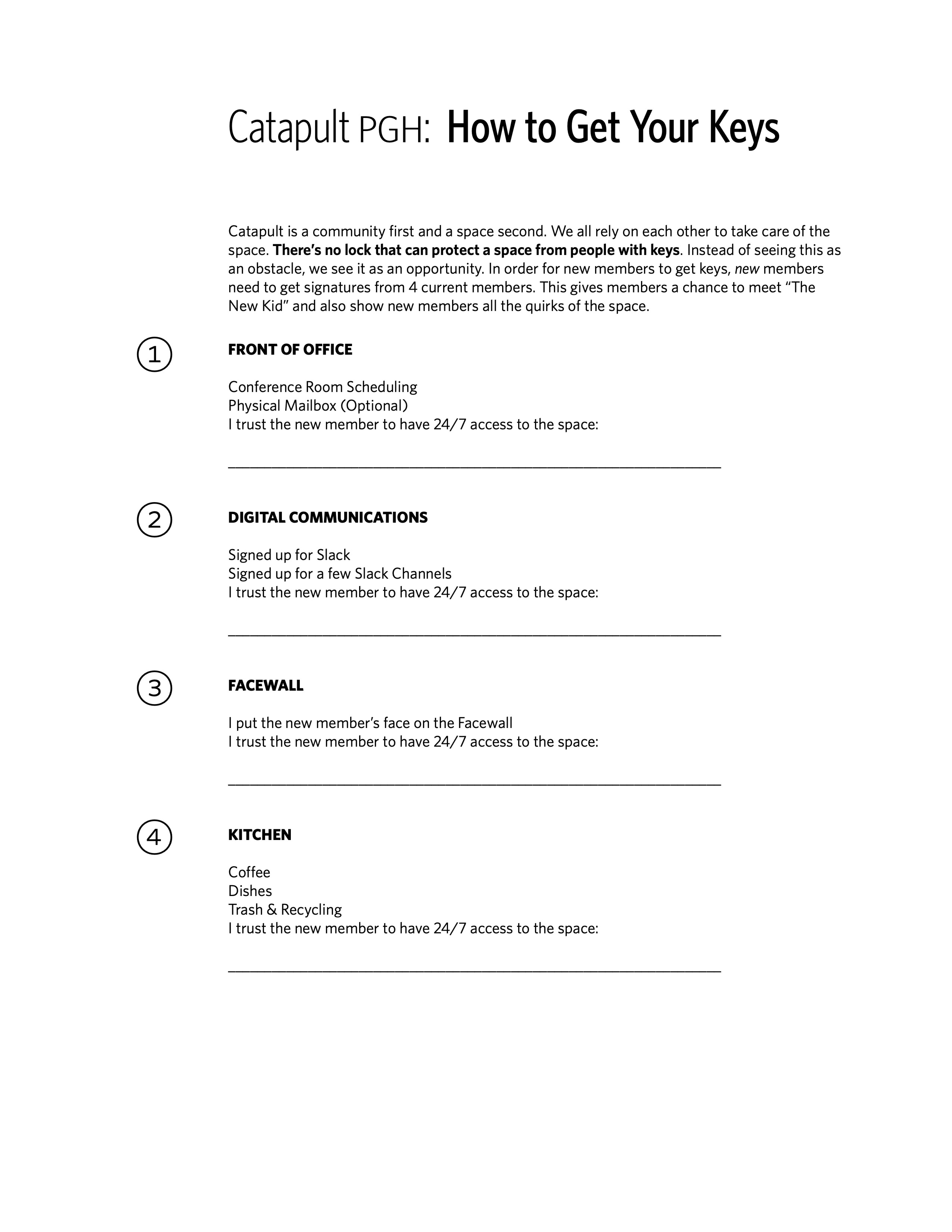 Nothing is new, and for a lot of inspiration on how to run a work community, I look to Alex Hillman at IndyHall. He decided to put the responsibility of deciding who to trust back on the community. In his Neighborhood Watch method, each new member has to get approval from several others to get a key.