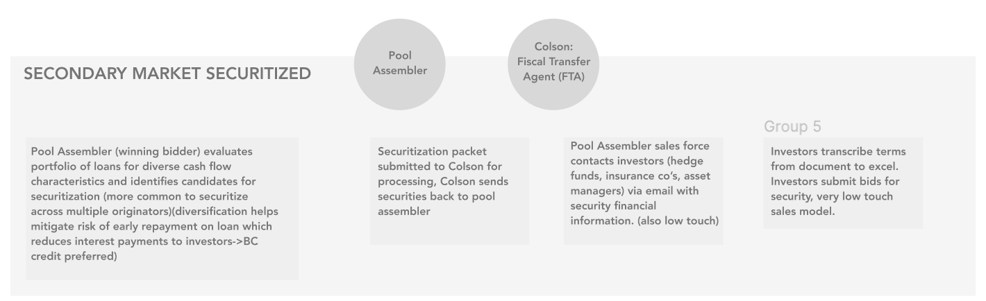 The secondary market was comprised of Pool Assemblers that spliced individual loans into traunched securities. After visiting some of their headquarters, we realized that this was a completely manual process, and that loans were never sold individually, just bucketed and tossed into Bloomberg.